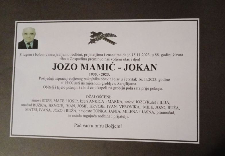 U srijedu, 15. studenog 2023. godine u 88. godini života blago u Gospodinu preminuo je Jozo Mamić – Jokan.