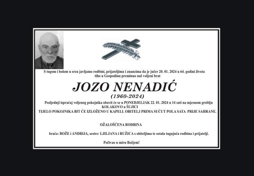 U subotu, 20. siječnja 2024. godine u 64. godini života blago u Gospodinu preminuo je Jozo Nenadić – Jozica.