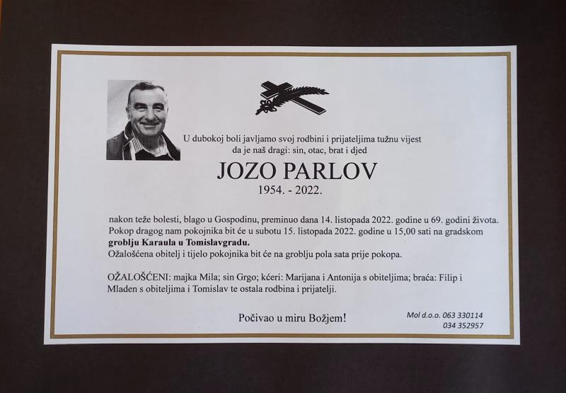 U petak, 14. listopada nakon teže bolesti u 69. godini života blago u Gospodinu preminuo je Jozo Parlov.