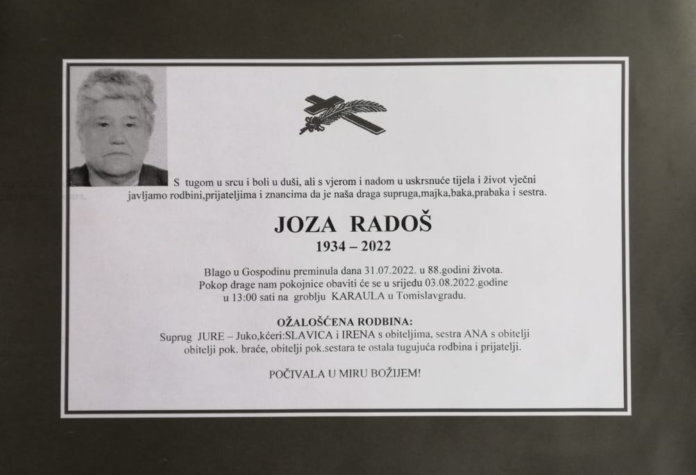 U nedjelju, 31. srpnja u 88. godini života blago u Gospodinu preminula je Joza Radoš.