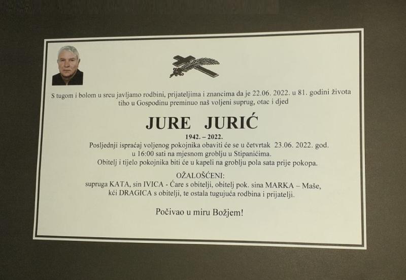 U srijedu, 22. lipnja u 81. godini života blago u Gospodinu preminuo je Jure Jurić.