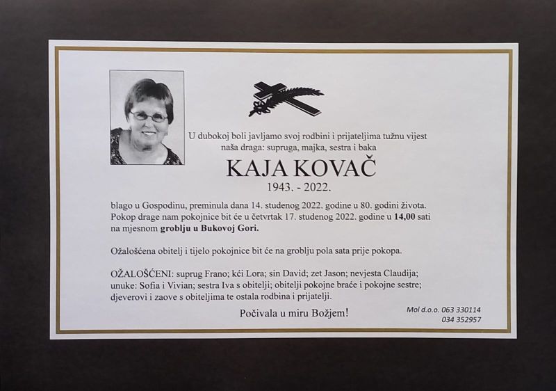 U ponedjeljak, 14. studenog 2022. godine u 80. godini života blago u Gospodinu preminula je Kaja Kovač.
