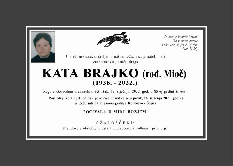 U četvrtak, 13. siječnja u 85. godini života blago u Gospodinu preminula je Kata Brajko, rođ. Mioč.