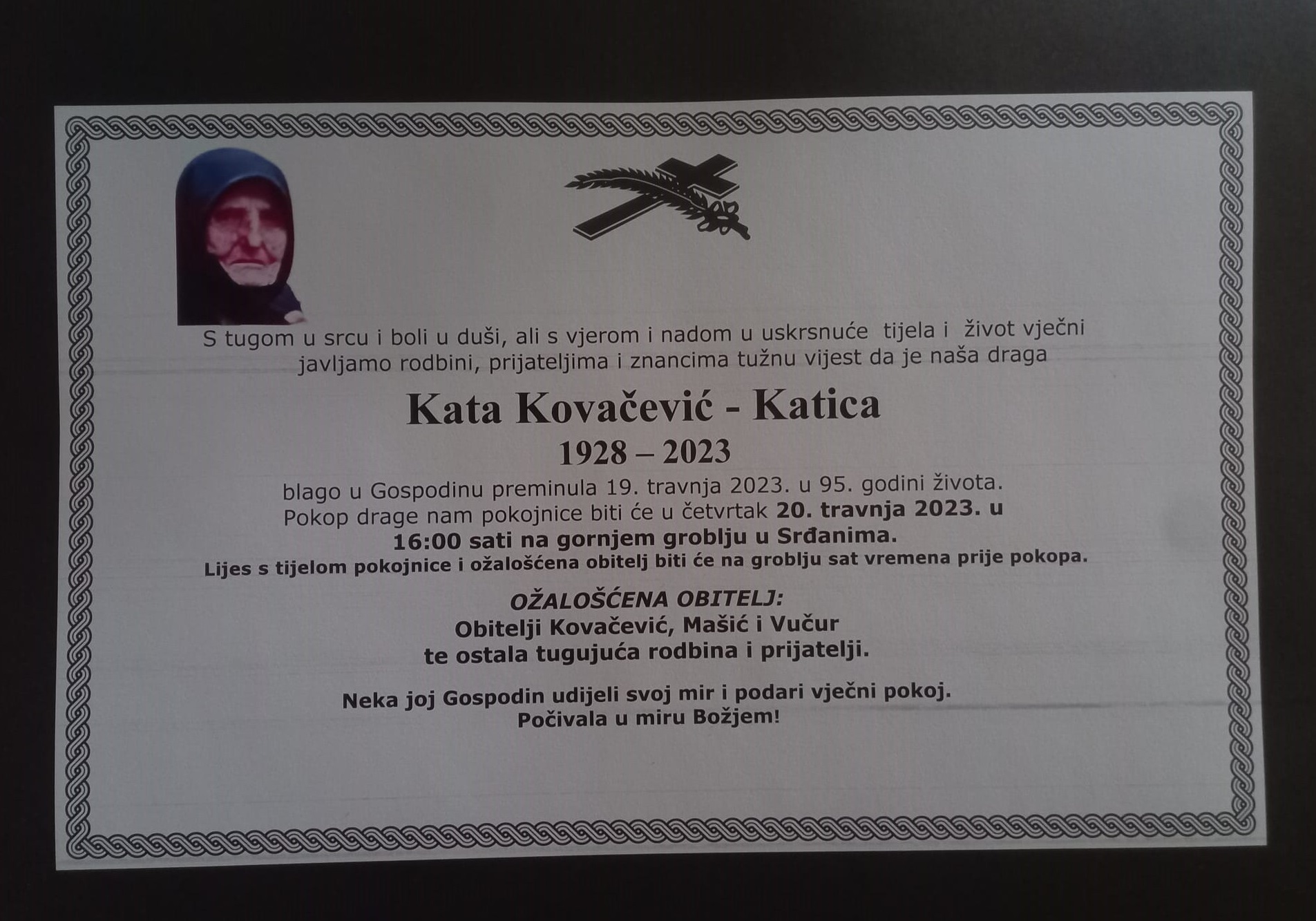U srijedu, 19. travnja u 95. godini života blago u Gospodinu preminula je Kata Kovačević – Katica.