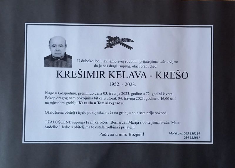 Posljednji ispraćaj bit će u utorak, 4. travnja 2023. godine u 16 sati na mjesnom groblju Karaula u Tomislavgradu.