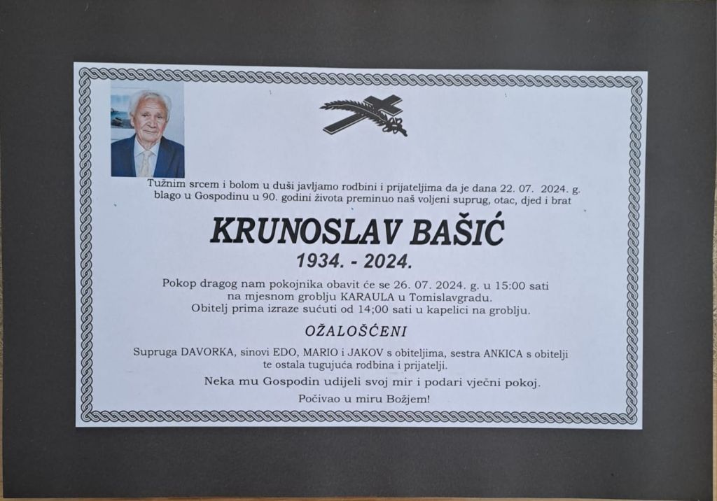 U ponedjeljak, 22. srpnja 2024. godine u 90. godini života blago u Gospodinu preminuo je Krunoslav Bašić.