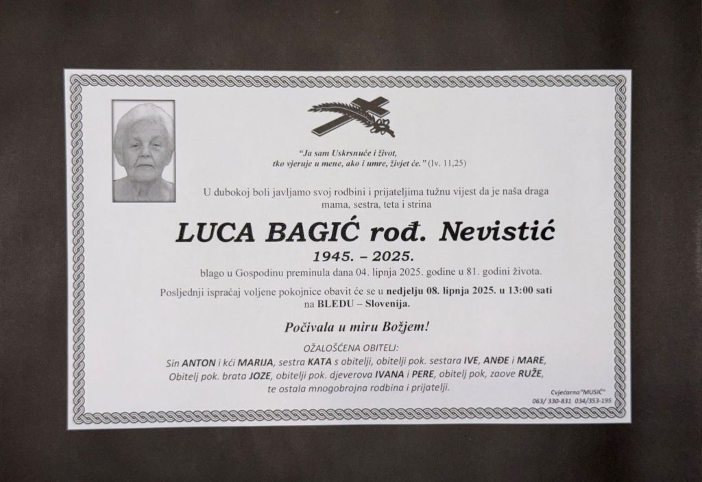 U srijedu, 4. lipnja 2025. u 81. godini života blago u Gospodinu preminula je Luca Bagić rođ. Nevistić.