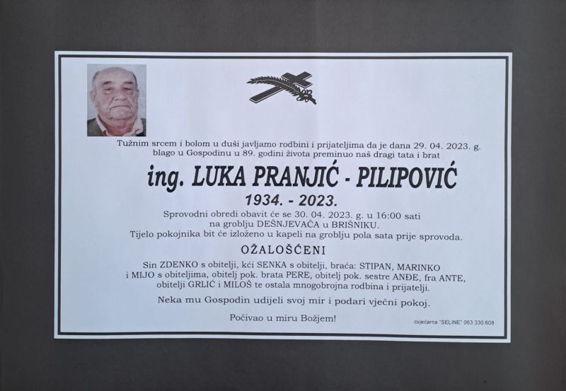 U subotu, 29. travnja u 89. godini života blago u Gospodinu preminuo je ing. Luka Pranjić – Pilipović.