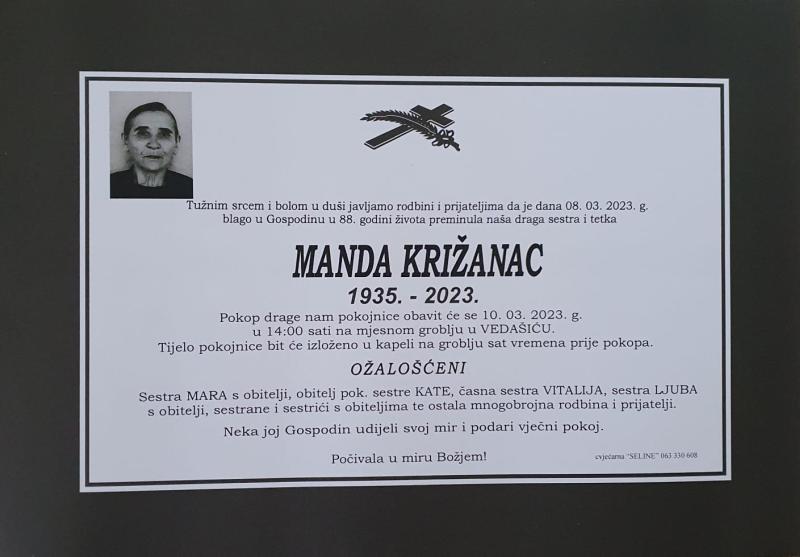 U srijedu, 8. ožujka u 88. godini života blago u Gospodinu preminula je Manda Križanac.
