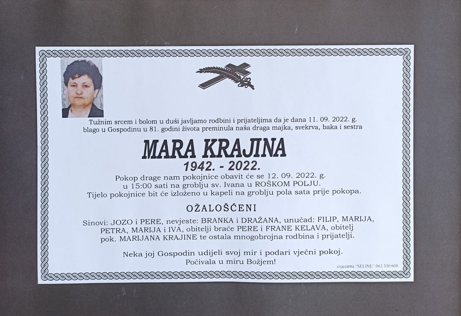 U nedjelju, 11. rujna u 81. godini života blago u Gospodinu preminula je Mara Krajina