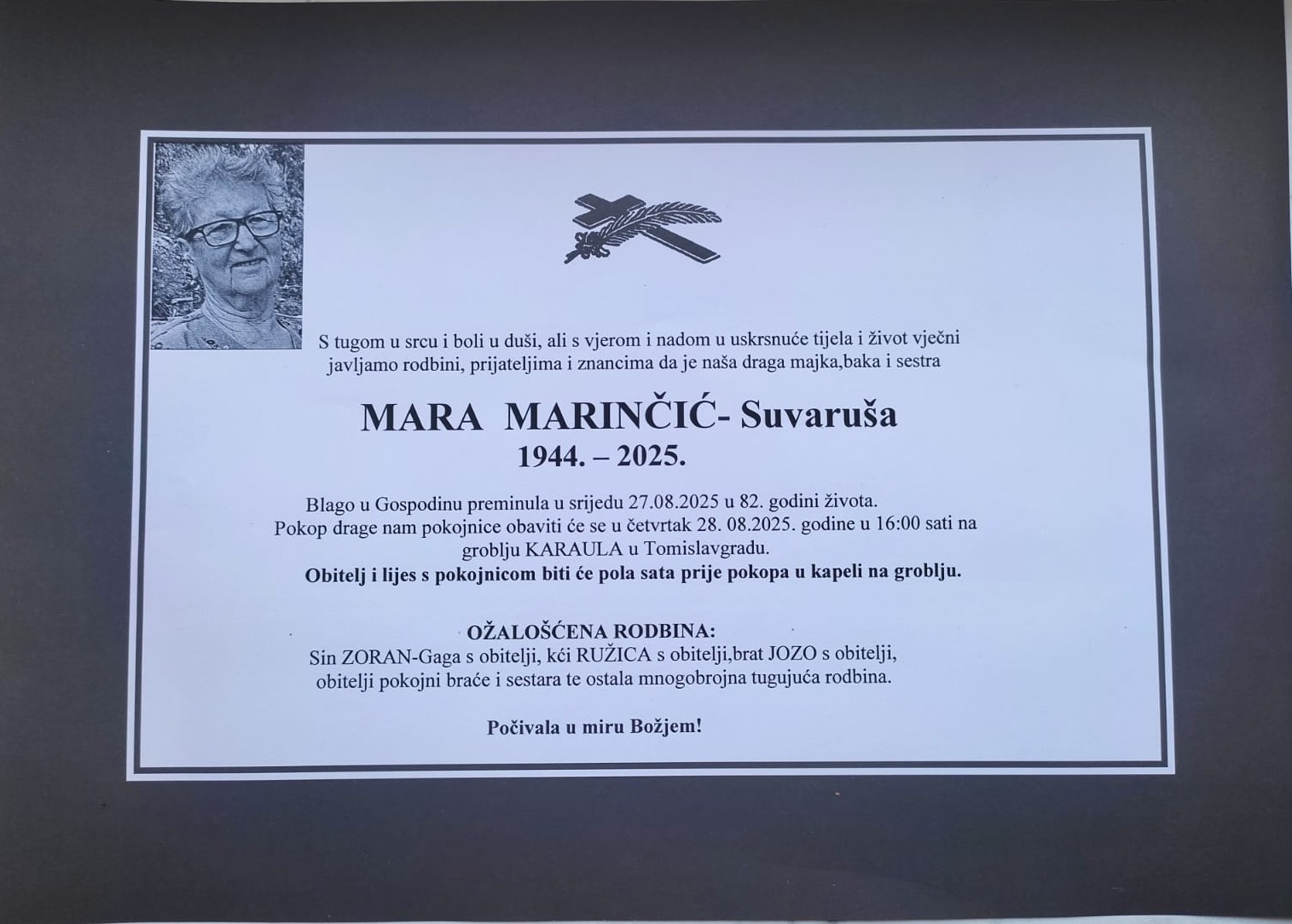 Posljednji ispraćaj bit će u četvrtak, 28. kolovoza 2025. godine u 16 sati na groblju Karaula u Tomislavgrad.