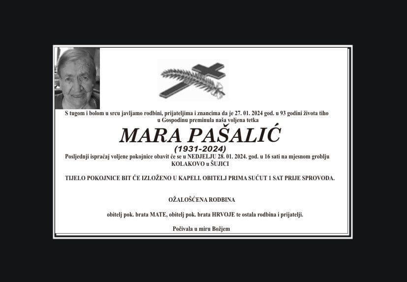 U subotu, 27. siječnja 2024. godine u 93. godini života blago u Gospodinu preminula je Mara Pašalić.