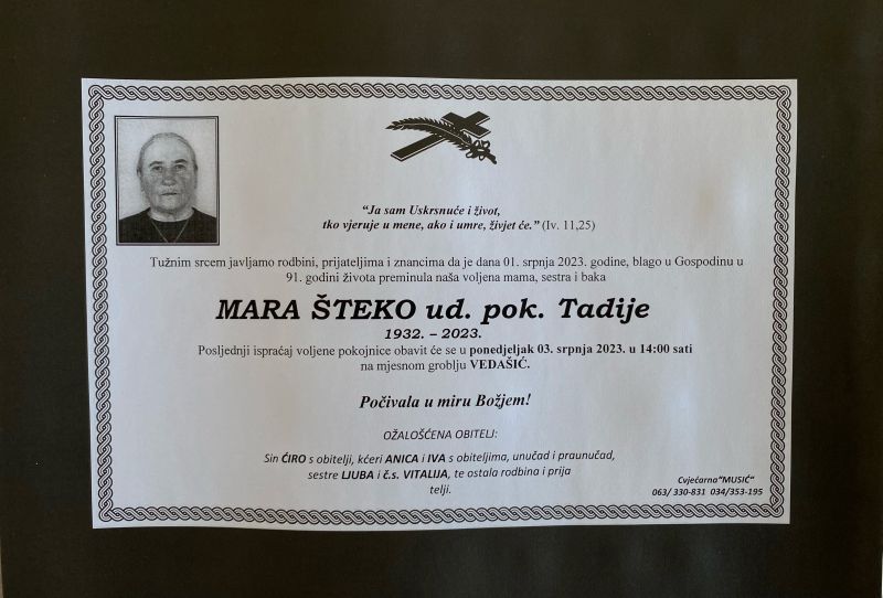 U subotu, 1. srpnja 2023. godine u 91. godini života blago u Gospodinu preminula je Mara Šteko ud. pok. Tadije.