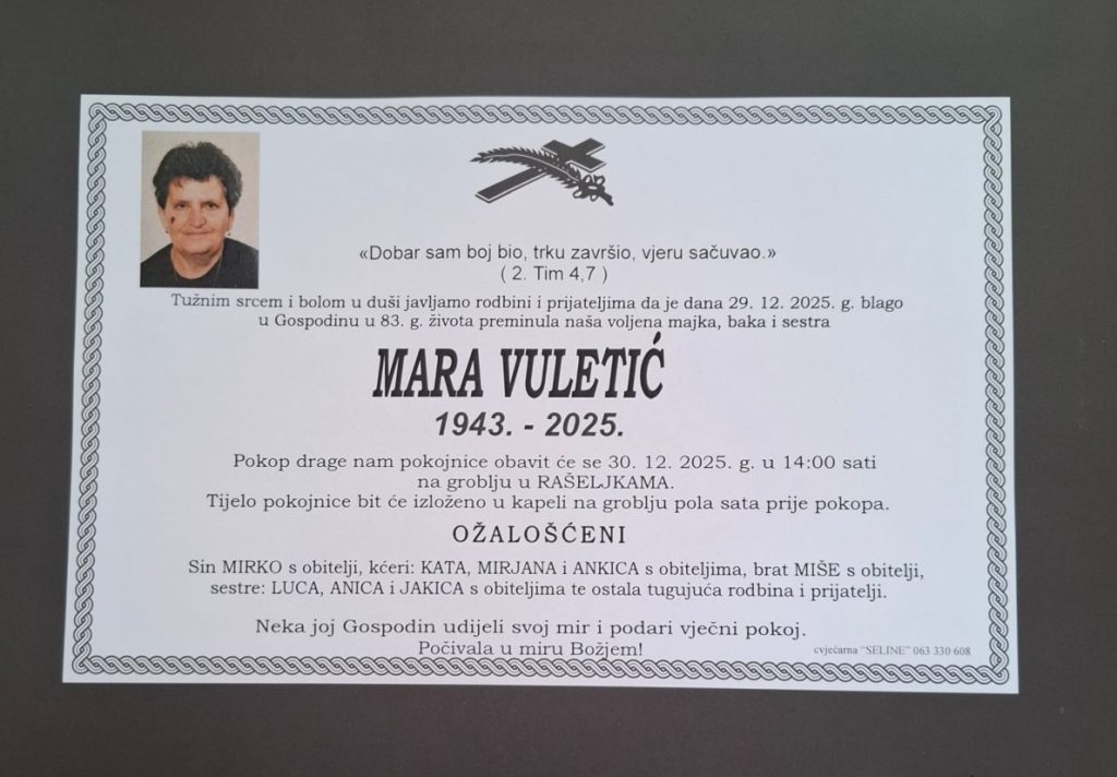 U ponedjeljak, 29. prosinca u 83. godini života blago u Gospodinu preminula je Mara Vuletić.