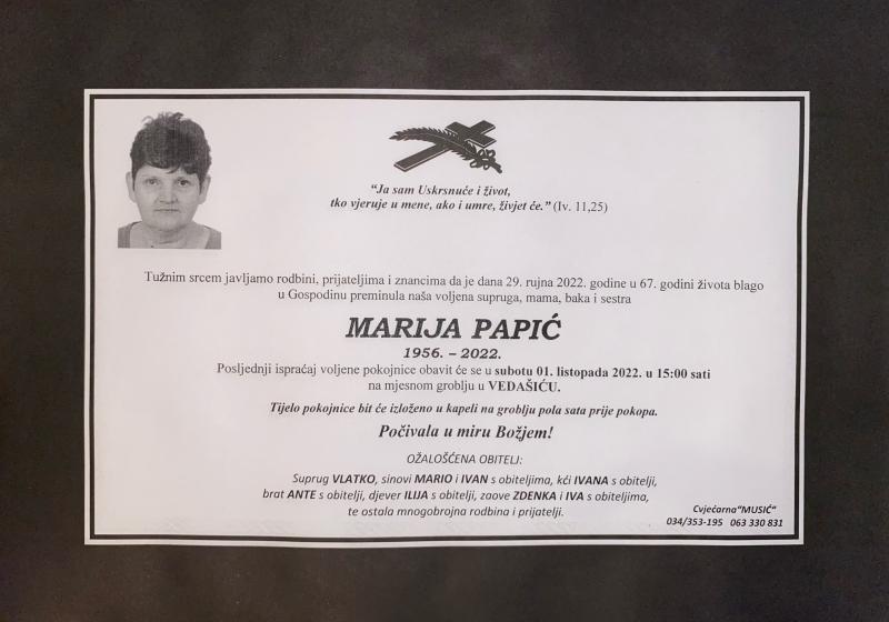 U četvrtak, 29. rujna u 67. godini života blago u Gospodinu preminula je Marija Papić.
