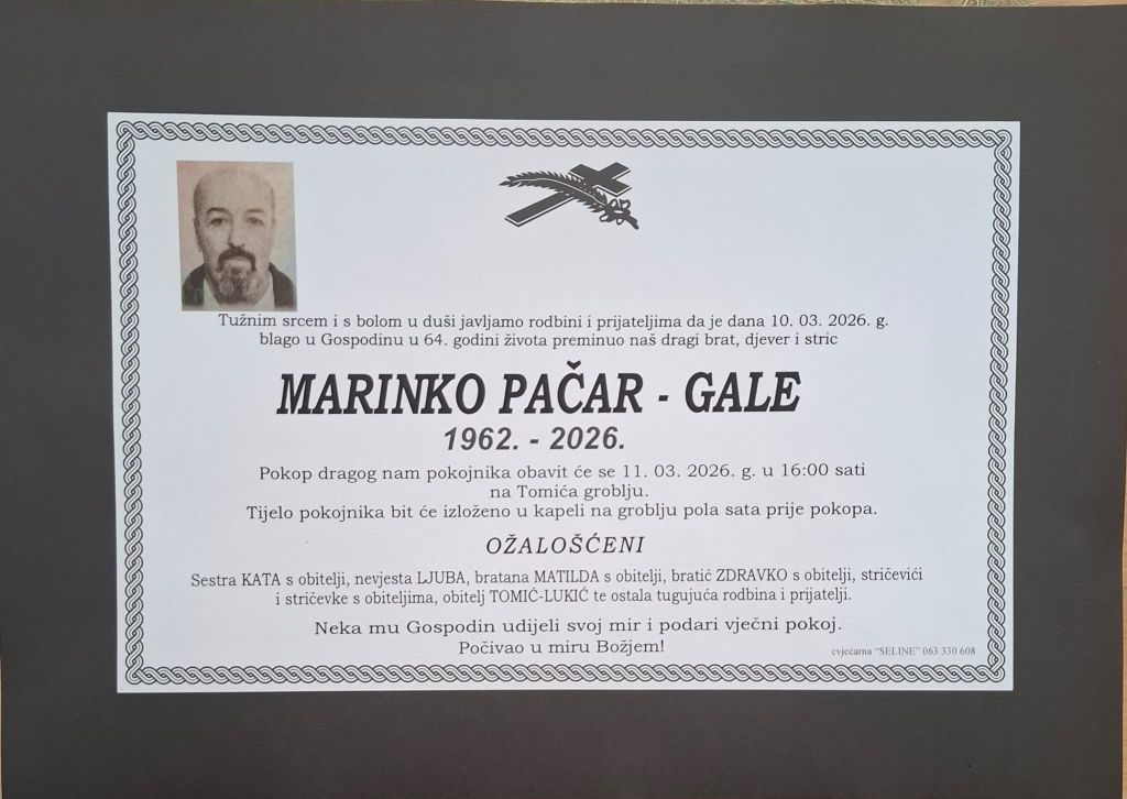 U utorak, 10. ožujka 2026. godine u 64. godini života blago u Gospodinu preminuo je Marinko Pačar – Gale.