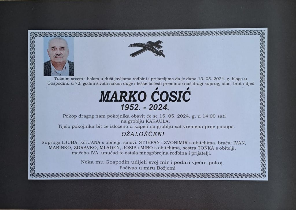 U ponedjeljak, 13. svibnja u 72. godini života nakon duge i teške bolesti, blago u Gospodinu preminuo je Marko Ćosić.
