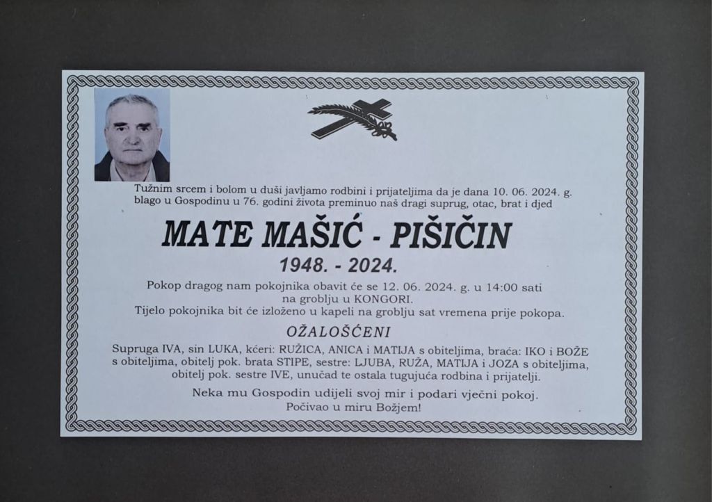 U ponedjeljak, 10. lipnja 2024. godine u 76. godini života blago u Gospodinu preminuo je Mate Mašić – Pišičin.