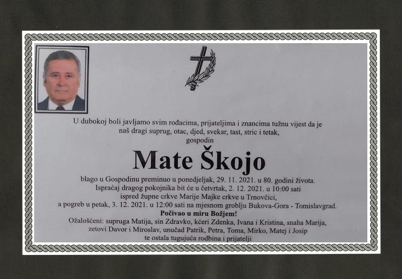 U ponedjeljak, 29. studenog u 80. godini života blago u Gospodinu preminuo je Mate Škojo.