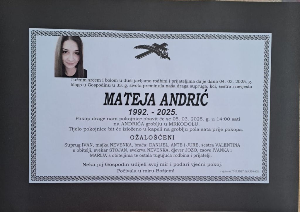 U utorak, 4. ožujka 2025. godine u 33. godini života blago u Gospodinu preminula je Mateja Andrić.