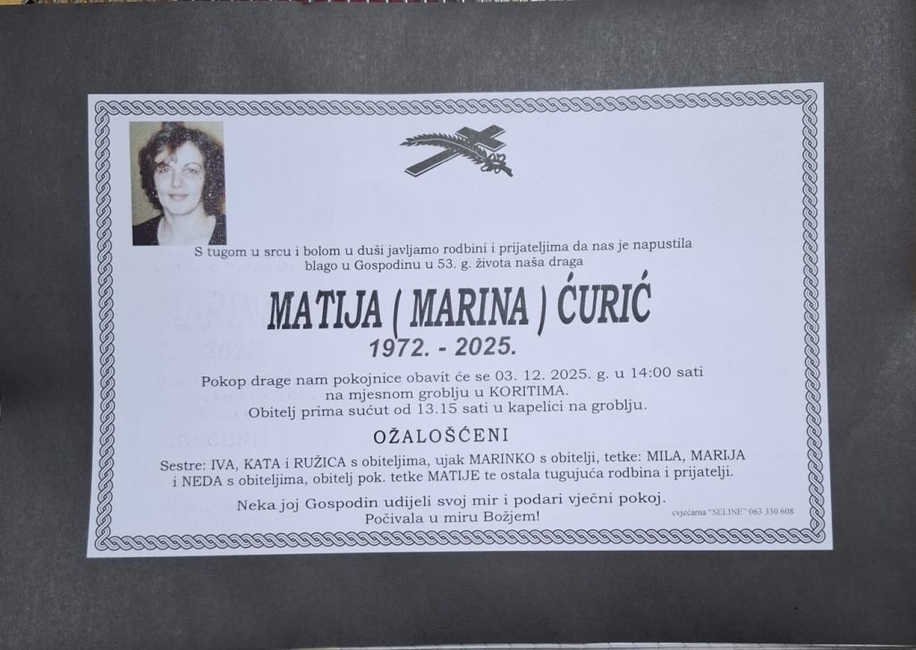 U 53. godini života blago u Gospodinu preminula je Matija (Marina) Ćurić.