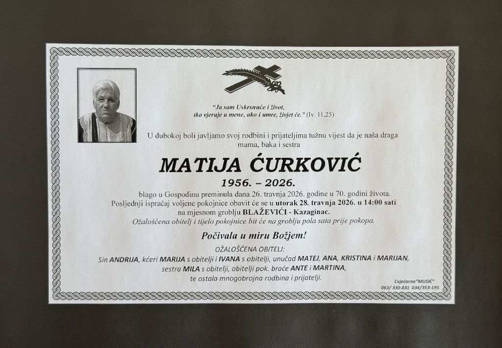 U nedjelju, 26. travnja 2026. godine u 70. godini života blago u Gospodinu preminula je Matija Ćurković.