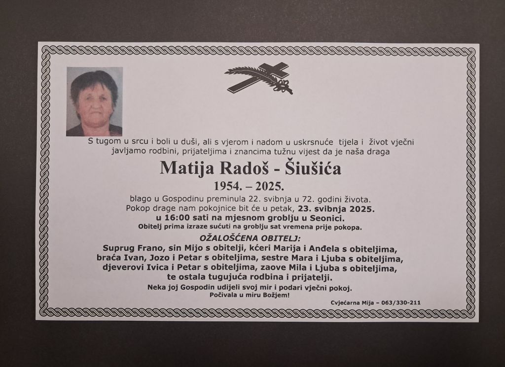 U četvrtak, 22. svibnja 2025. godine, u 72. godini života blago u Gospodinu preminula je Matija Radoš – Šiušića.