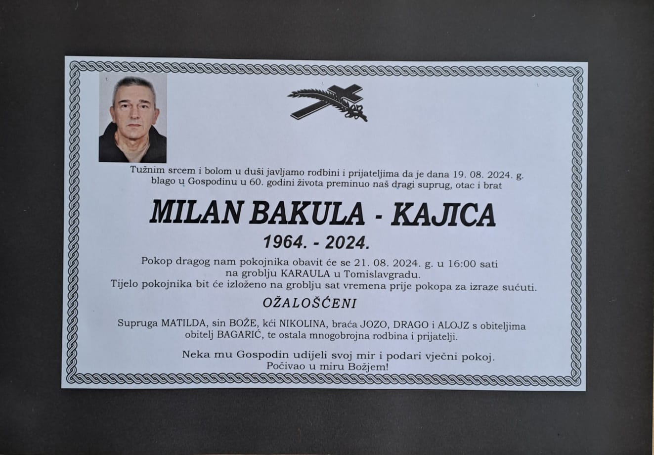 U ponedjeljak, 19. kolovoza 2024. godine u 60. godini blago u Gospodinu preminuo je Milan Bakula – Kajica.