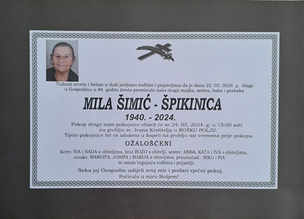 U petak, 22. ožujka 2024. godine u 84. godini života blago u Gospodinu preminula je Mila Šimić – Špikinica.