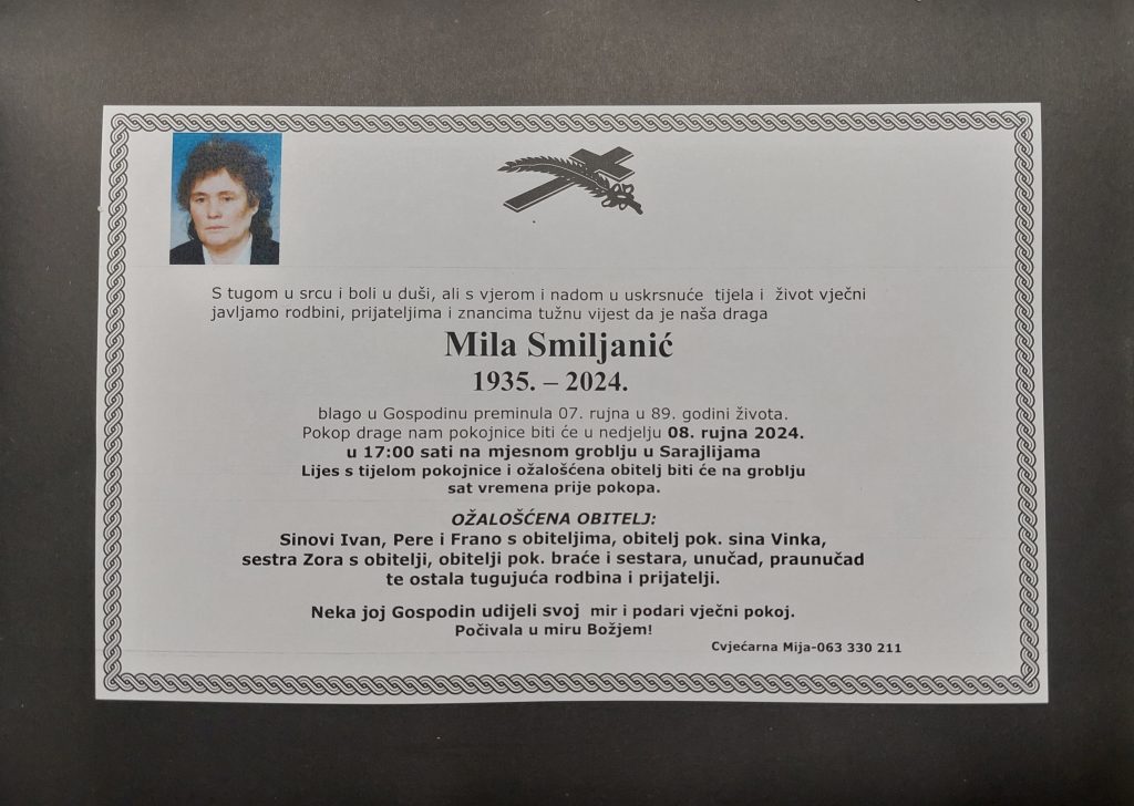 U petak, 7. rujna u 89. godini života blago u Gospodinu preminula je Mila Smiljanić.