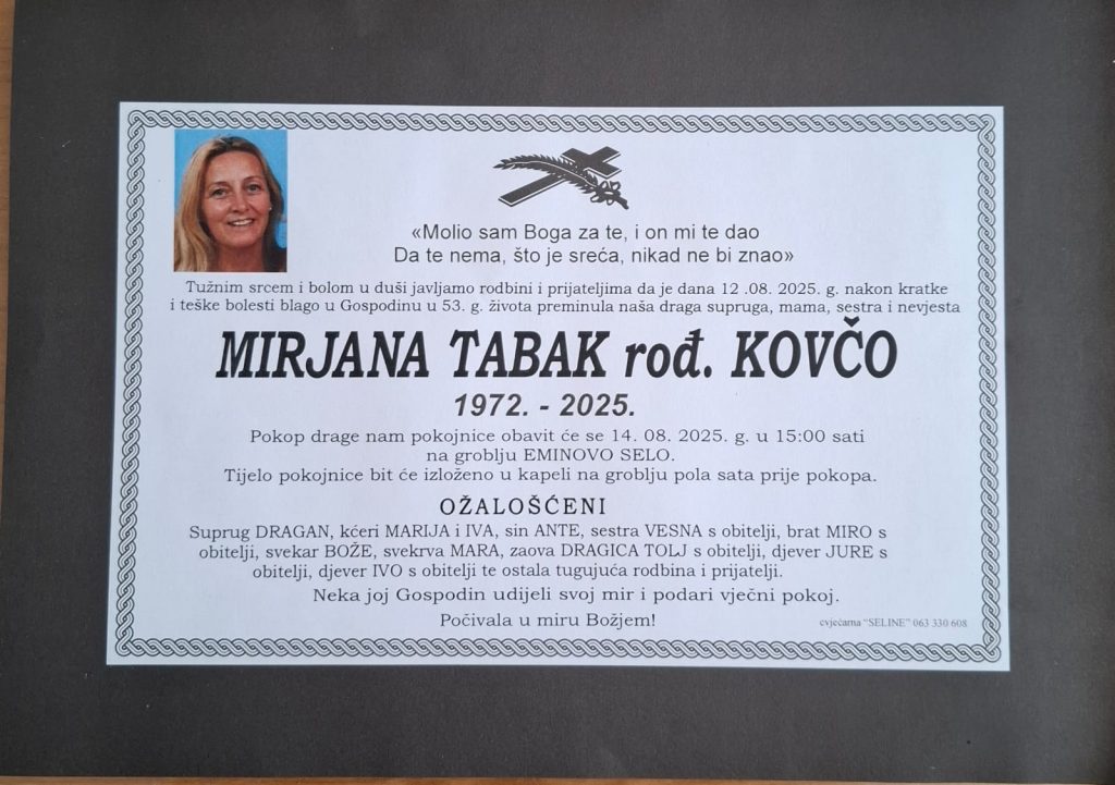 U utorak, 12. kolovoza 2025. godine, u 53. godini života nakon kratke i teške bolesti blago u Gospodinu preminula je Mirjana Tabak, rođ. Kovčo.