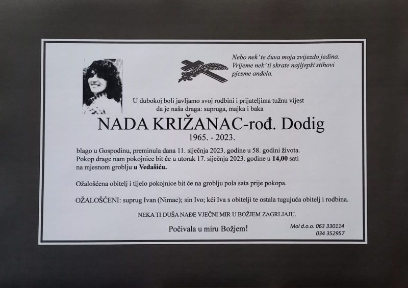 U srijedu, 11. siječnja 2023. godine u 58. godini života blago u Gospodinu preminula je Nada Križanac, rođ. Dodig.