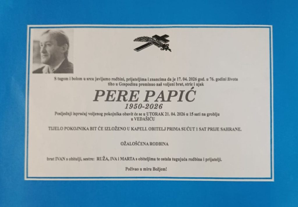 U petak, 17. travnja 2026. godine u 76. godini života blago u Gospodinu preminuo je Pere Papić.