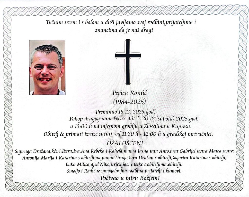 U četvrtak, 18. prosinca 2025. u 41. godini života preminuo je Perica Romić.