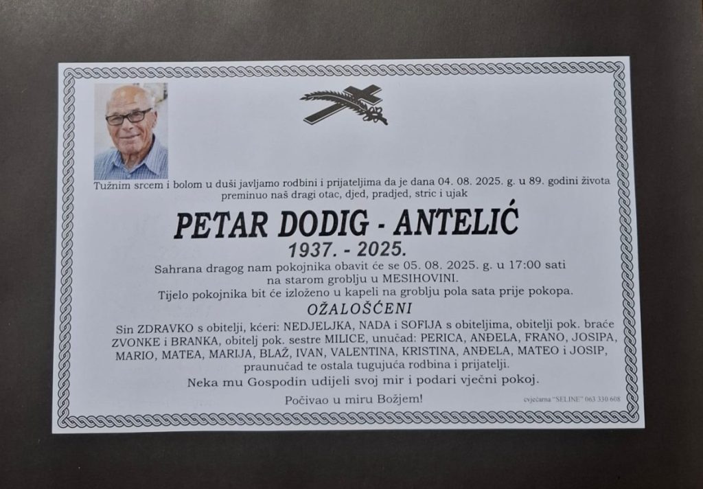 U ponedjeljak, 4. kolovoza u 89. godini života blago u Gospodinu preminuo je Petar Dodig – Antelić.