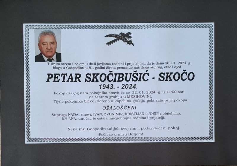 U subotu, 20. siječnja 2024. godine u 81. godini života blago u Gospodinu preminuo je Petar Skočibušić – Skočo.