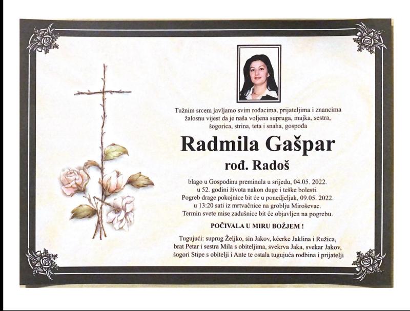 U srijedu, 4. svibnja u 52. godini života nakon duge i teške bolesti blago u Gospodinu preminula je Radmila Gašpar – rođ. Radoš.