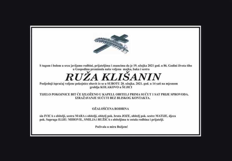 U subotu 20. ožujka, u 86. godini života blago u Gospodinu preminula je Ruža Klišanin.