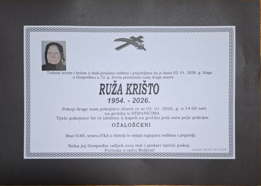 U petak, 2. siječnja 2026. godine, u 72. godini života blago u Gospodinu preminula je Ruža Krišto.