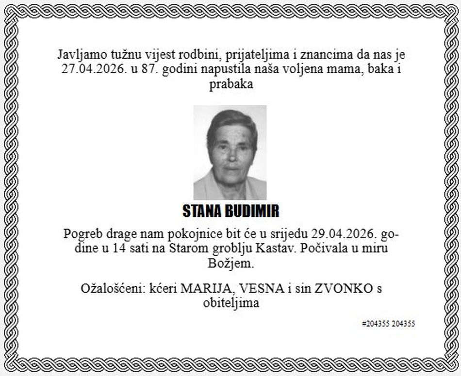 U ponedjeljak, 27. travnja 2026. godine u 87. godini života, blago u Gospodinu preminula je Stana Budimir.