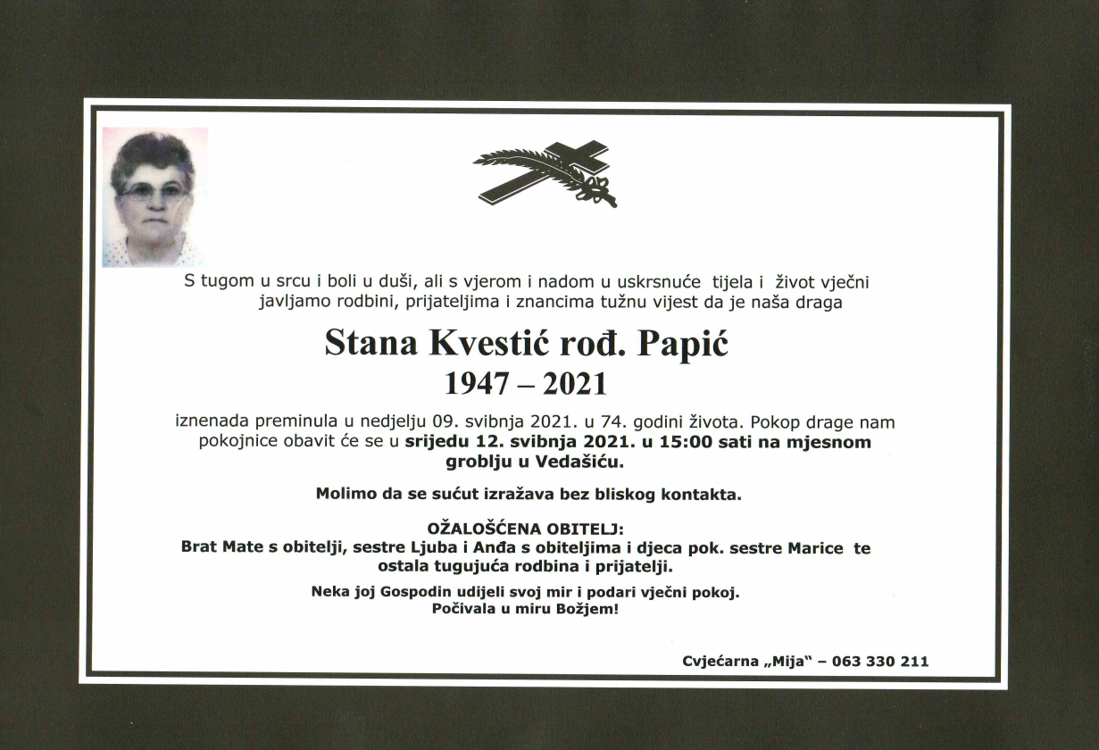 U nedjelju 9. svibnja, u 74. godini života blago u Gospodinu preminula je Stana Kvestić rođena Papić.