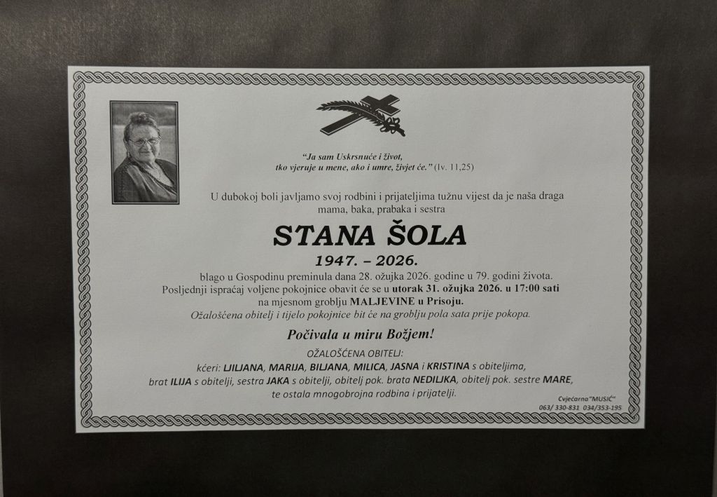 U subotu, 28. ožujka 2026. godine u 79. godini života blago u Gospodinu preminula je Stana Šola.