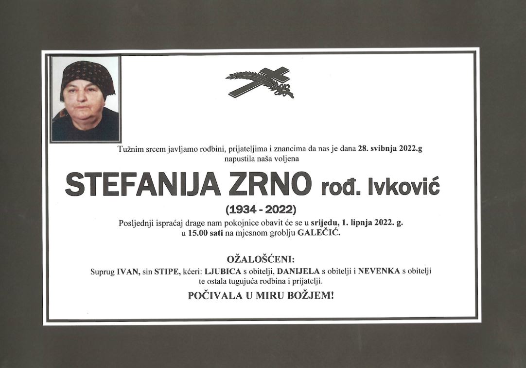 U subotu, 28. svibnja blago u Gospodinu preminula je Stefanija Zrno (rođ. Ivković).