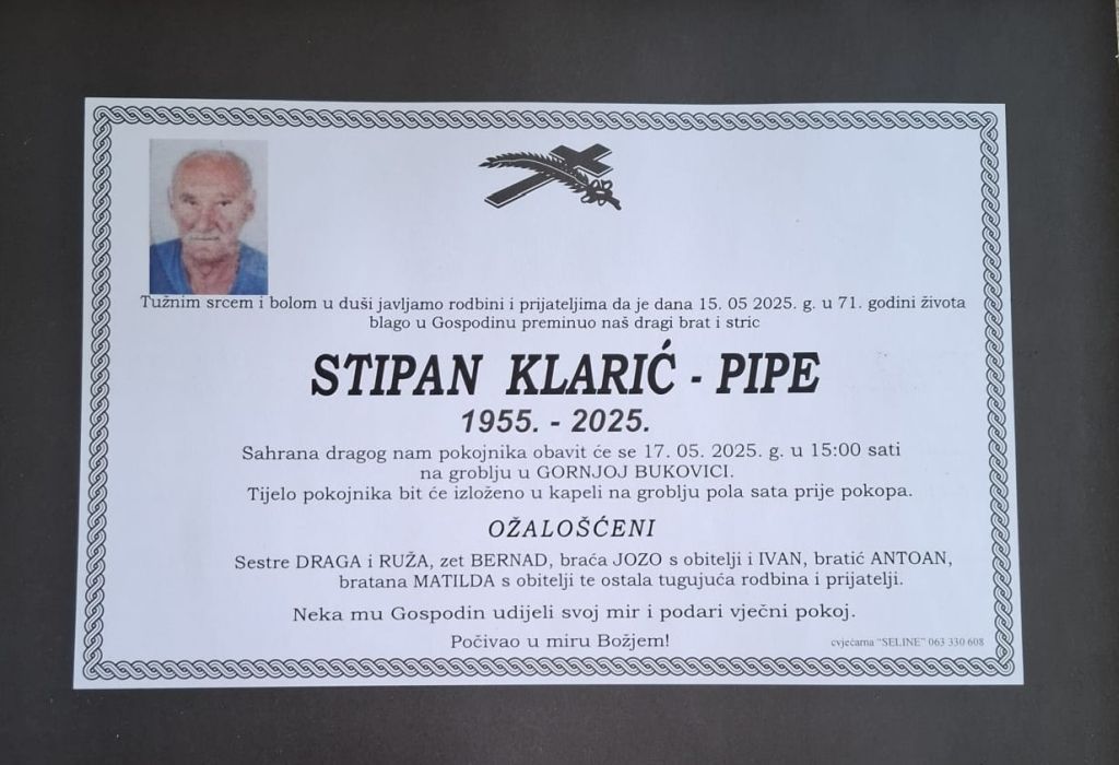 U četvrtak, 15. svibnja 2025. u 71. godini života blago u Gospodinu preminuo je Stipan Klarić – Pipe.