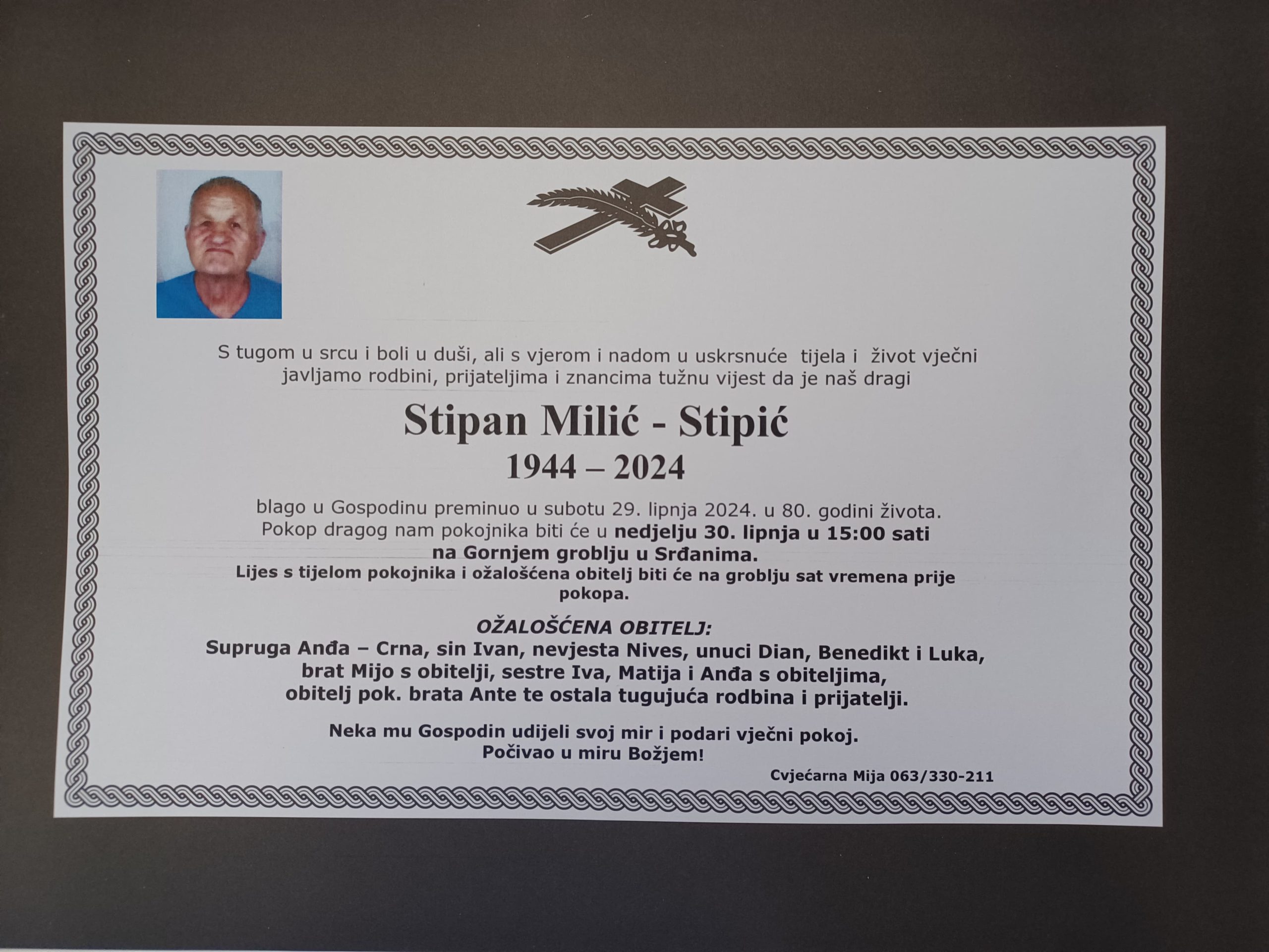 U subotu, 29. lipnja 2024. godine u 80. godini života blago u Gospodinu preminuo je Stipan Milić – Stipić.