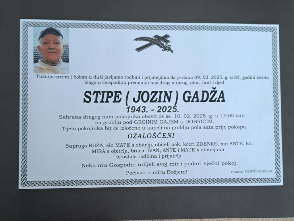 U nedjelju, 9. veljače 2025. u 83. godini života i blago u Gospodinu preminuo je Stipe Gadža.