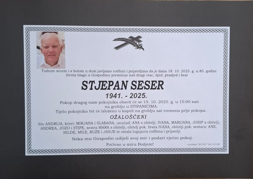 U subotu, 18. listopada 2025. godine u 85. godini života blago u Gospodinu preminuo je Stjepan Seser.