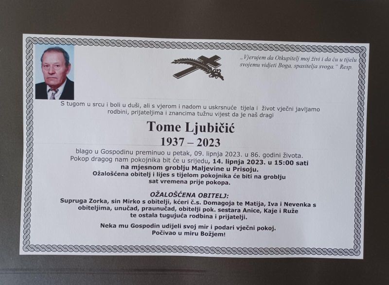 U petak, 9. lipnja u 86. godini života blago u Gospodinu preminuo je Tome Ljubičić.