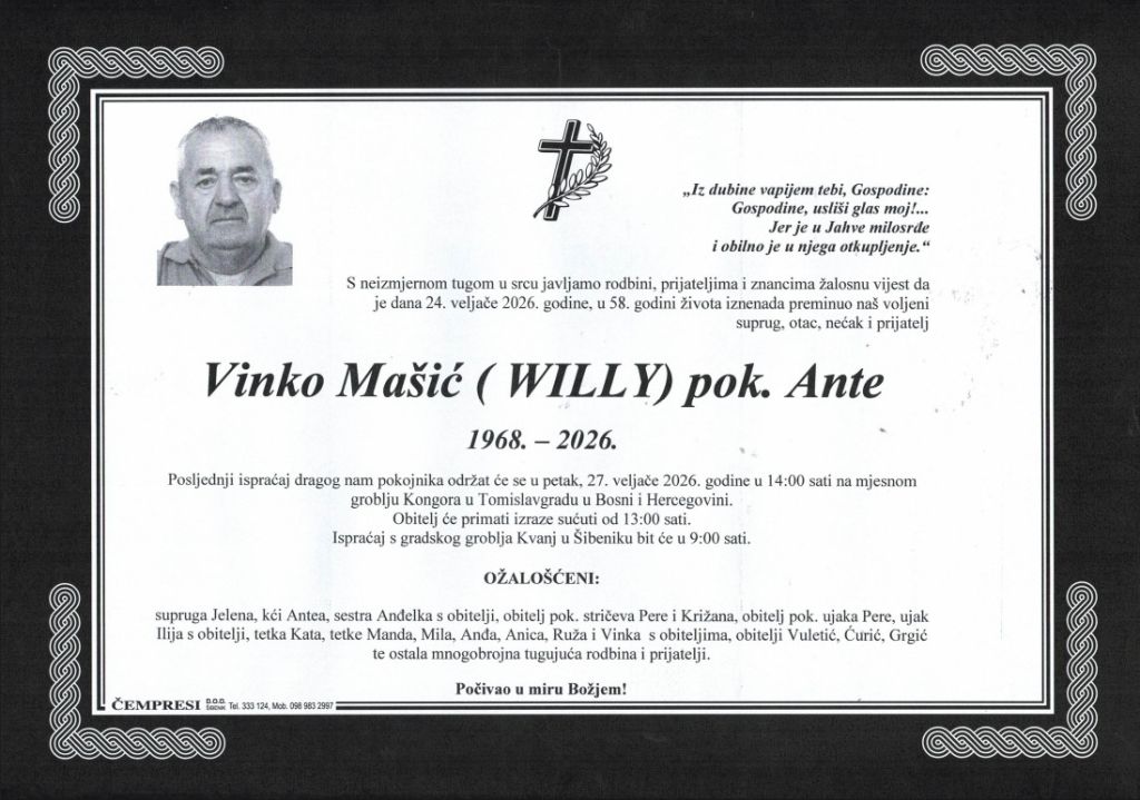 U utorak, 24. veljače 2026. godine u 58. godini života blago u Gospodinu preminuo je Vinko Mašić Willy, pok. Ante.