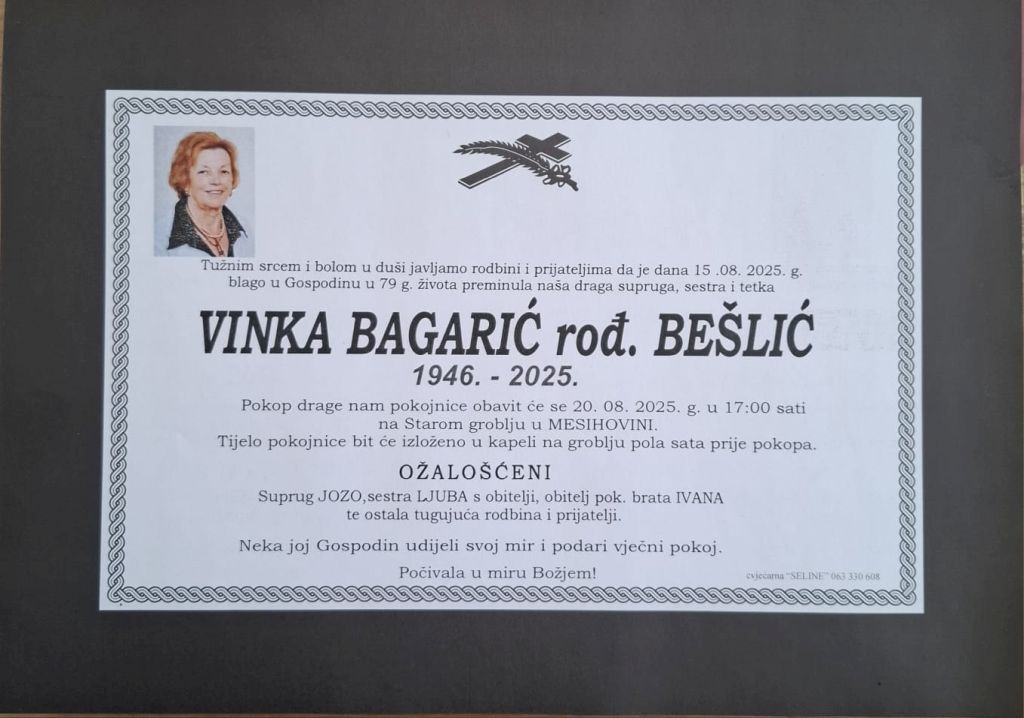 U petak, 15. kolovoza u 79. godini života blago u Gospodinu preminula je Vinka Bagarić rođ. Bešlić.